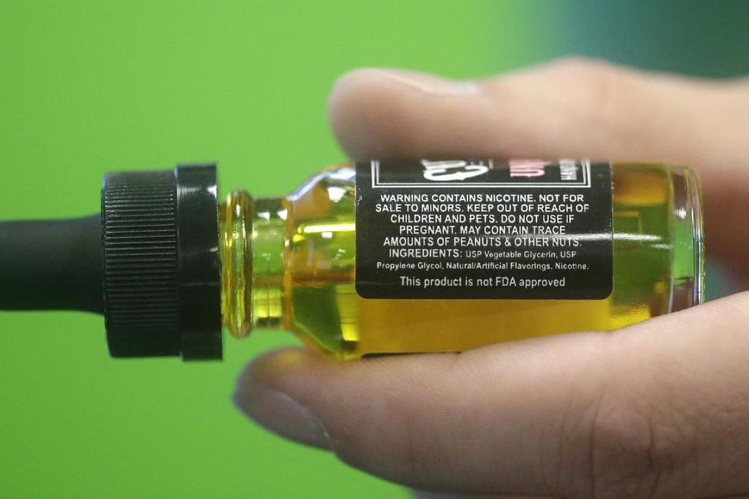 圖片説明:電子煙液必須使用兒童防禦性包裝,並有“防止孩子接觸”等字樣。/AP