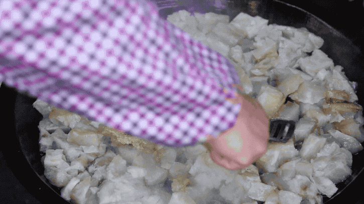 而燜子的做法也非常簡單,就是將地瓜、玉米或綠豆加工成粉末,摻上水揉成團蒸熟,冷卻之後再像切豆腐那樣切成許多啤酒瓶子蓋那麼大的方塊,之後就可以在平底的油鍋上煎烙或炒熟。