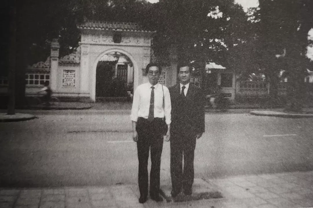 2000年春,作者和曾任胡志明秘書的武奇在胡志明博物館前留影。(《中越關係四十年親歷》圖)