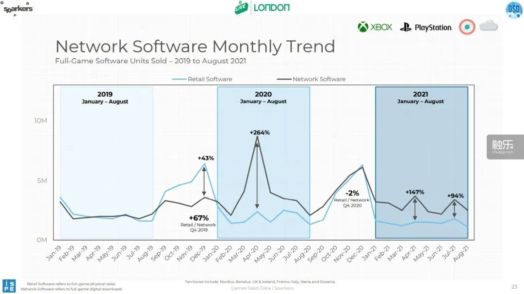 實際上,在同一份報告裏,數據仍然證明了數字版遊戲增長極為迅速,尤其是在疫情影響之下。報告顯示,從2019年1月到2021年8月,全球各平台數字版遊戲銷量為1.02億份,實體版只有8100萬份,差距已經不小。最明顯的例子則是2020年4月,由於不少國家防疫政策升級,許多人在家隔離或減少出行,數字平台卻沒有大幅度打折活動,因此數字版遊戲銷售額激增,比實體版高出了264%——這就更誇張了。對此,分析師説“2020年春天徹底改變了消費者購買遊戲的方式”,似乎並不為過。