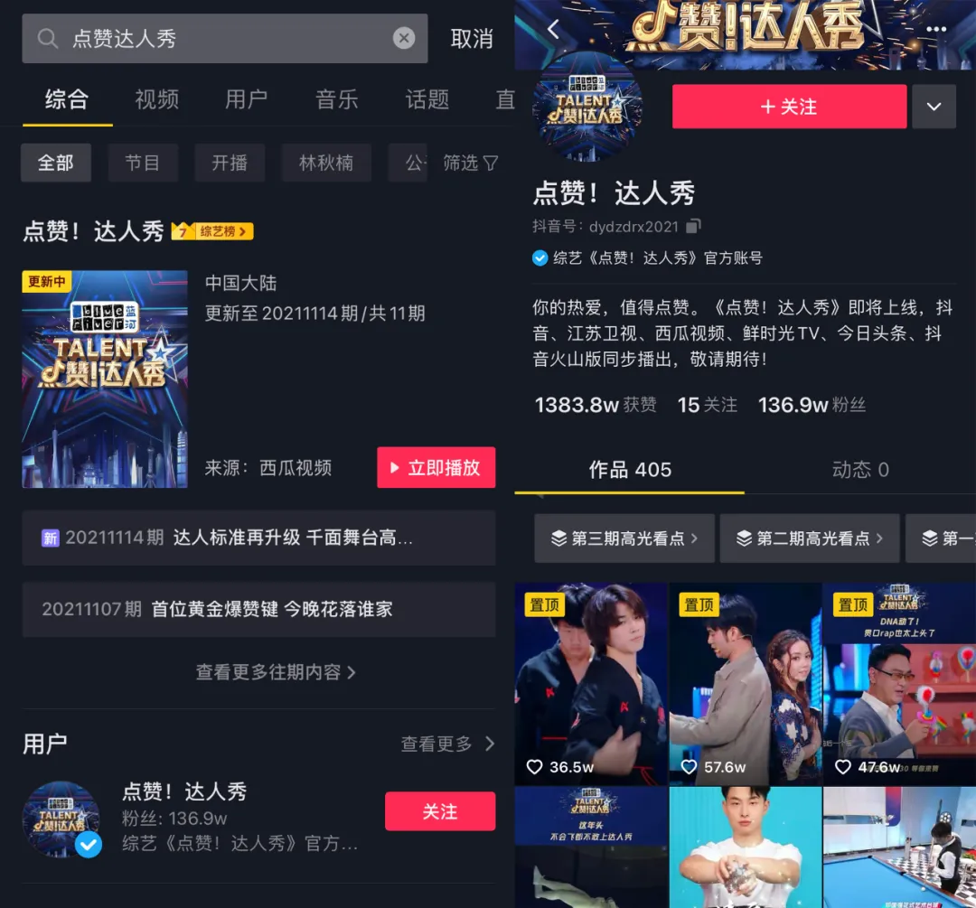 近期,抖音、江蘇衞視、燦星聯合出品了一檔新綜藝——《點贊!達人秀》。截至目前,節目相關話題通過網絡不斷髮酵,全網熱點數34,全網曝光31億。相較於其它綜藝“扯頭花”“做數據”的激烈打投模式,這個綜藝顯得格外温柔:“點贊”互動設置成為了《點贊!達人秀》這款節目的亮眼之處,成為了日常生活中高光時刻的展示舞台。這種綜藝機制的改變無疑説明了當前內容生產的一大趨勢:短視頻中優質的內容藍本正在逐漸浮出水面,藉助優質的平台,進行高完成度的產品轉化——好的內容和生活,總值得被更多人看見。