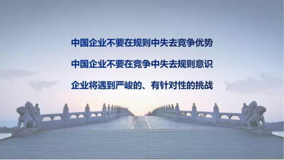 非常誠懇地告訴企業們,我們中國企業不要在規則中失去競爭優勢,更不應該在競爭中失去規則意識。我相信中國的企業在未來的發展,能夠把自己的合規建設的更好,也一定會在競爭當中,維護自身的競爭優勢,使得我們國家的企業穩步走向世界,走向規則。謝謝大家。(本文根據錄音整理。)