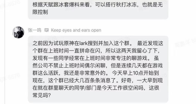 故事發生在工作日的下午3點20分,張一鳴突然在飛書的“原神”遊戲羣裏開麥,對員工的摸魚閒聊表達了不滿,不滿中帶着困惑:“今天早晨10點開始到現在,這個羣已經幾百條消息了。好奇,一大早到現在就在羣裏聊天的同學/部門是今天工作很空閒嗎,這很常見嗎?”