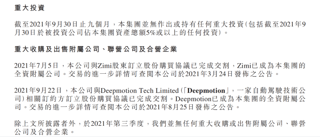 而縱向收購代表是9月22日小米全資收購的自動駕駛技術公司Deepmotion(深動科技),後者的核心團隊出自微軟亞洲研究院,主要提供以高精地圖為核心的自動駕駛解決方案,主要產品為多傳感器融合感知模組、高精地圖自動化構圖、高精度定位等等。