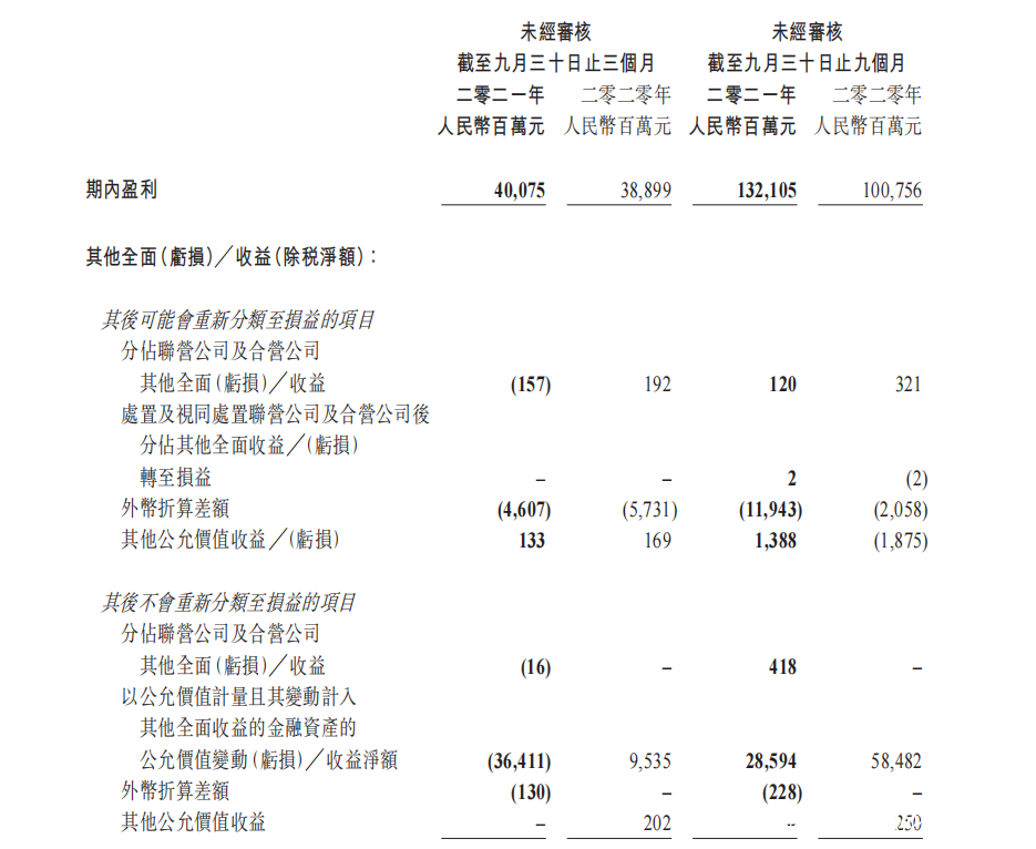 2021年三季報顯示,騰訊分佔聯營公司及合營公司可能會重新分類至損益的其他全面損益從去年同期的收益1.92億元轉為虧損1.57億元;以公允價值計量,變動計入其他全面收益的金融資產價值變動從去年同期的收益95.35億元轉為虧損364.11億元。甚至疊加計算後,騰訊的期內全面收益將由盈轉虧。