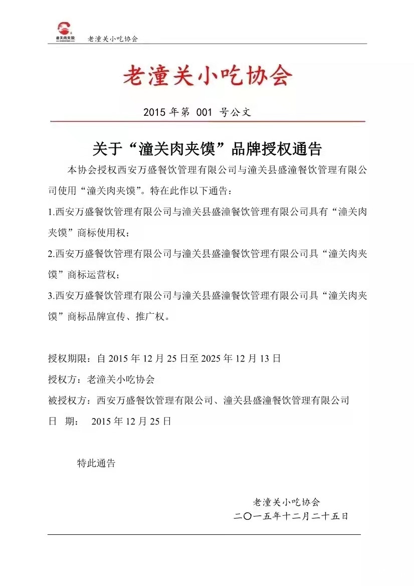 “潼關肉夾饃協會”的官方微信公號“潼關肉夾饃”文章披露,2015年12月25日,老潼關小吃協會將“潼關肉夾饃”品牌授權給“西安萬盛餐飲管理有限公司”與“潼關縣盛潼餐飲管理有限公司”兩家公司,進行該商標的使用、運營。