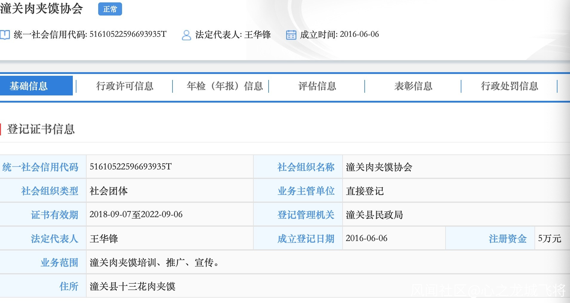 **全國社會組織信用信息公示平台的信息顯示,潼關肉夾饃協會成立於2016年6月6日,法定代表人王華鋒。****該協會為社會團體,註冊資本5萬元,**地址為潼關縣十三花肉夾饃,登記機關為潼關縣民政局,證書有效期為2018年9月7日至2022年9月6日。