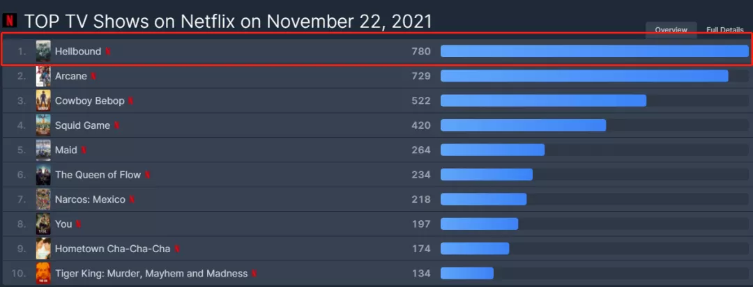 這也是韓劇首次在這麼短的時間內登上網飛電視劇收視排行榜TOP1。