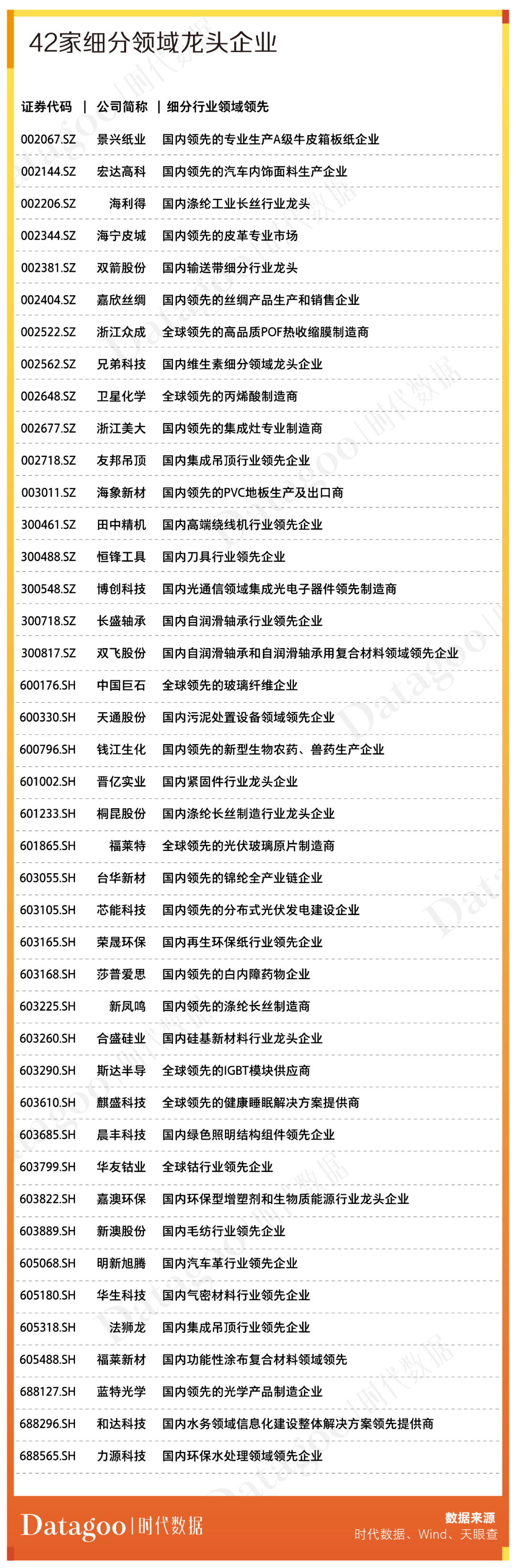**據時代數據梳理,在49家公司中,有42家公司屬於各個行業細分領域的領先企業,佔比超八成。**其中,浙江眾成(002522)、衞星化學(002648)、中國巨石(600176)、福萊特(601865)、斯達半導(603290)、麒盛科技(603610)、華友鈷業(603799)等企業的核心技術或產品銷量已位居全球前列。
