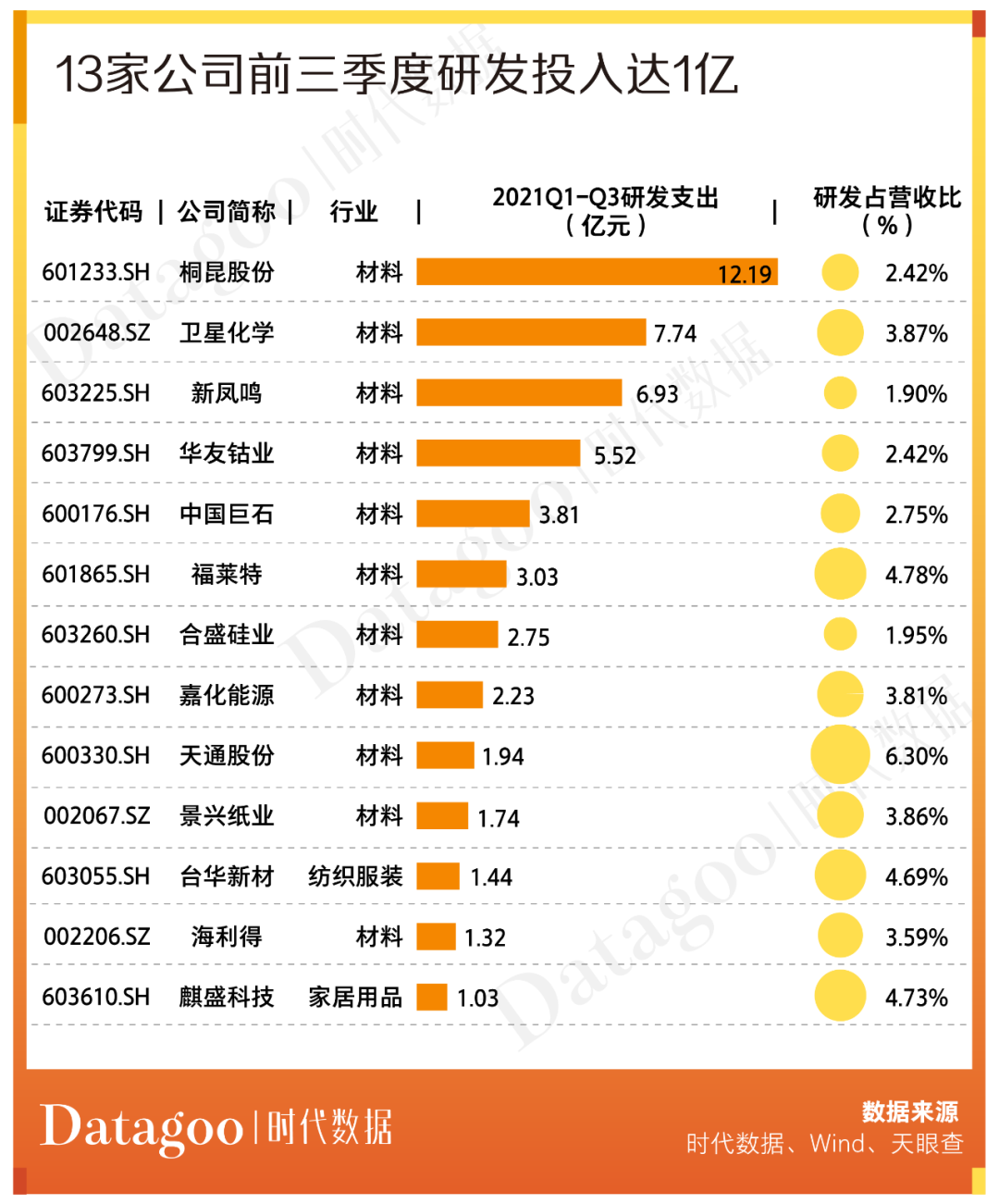 其中,桐昆股份(601233)的研發投入高居第一,高達12.19億元,佔前三季度營收的2.42%。全球領先的丙烯酸製造商衞星化學(002648)緊隨其後,研發投入7.74億元,佔前三季度營收的3.87%。此外,新鳳鳴(603225)以6.93億元的研發支出排在第三。