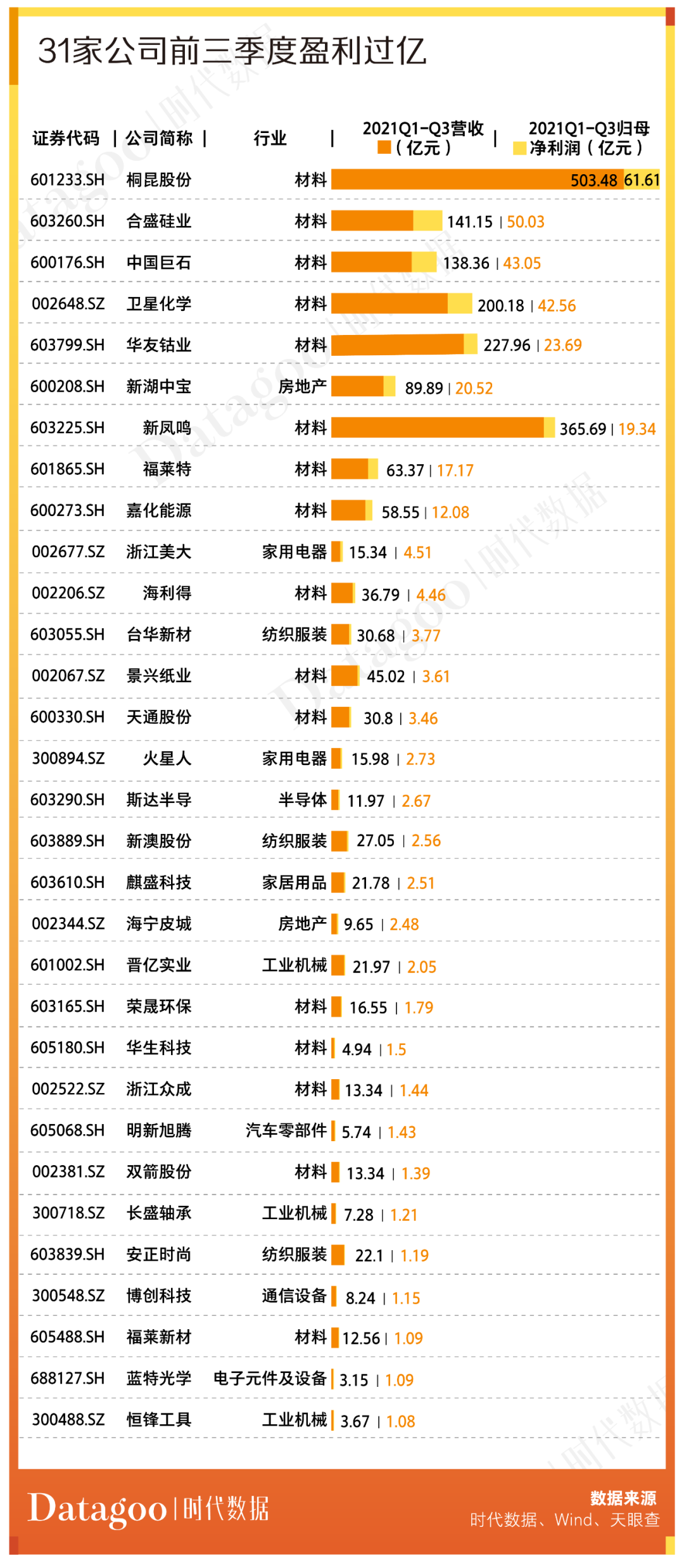 值得注意的是,前三季度歸母淨利潤超過10億元有9家。其中,桐昆股份(601233)業績雄踞第一,前三季度營收503.48億元、歸母淨利潤61.61億元。其後,國內硅基新材料行業龍頭企業合盛硅業(603260)前三季度營收141.15億元、歸母淨利潤50.03億元,排在第二;中國巨石(600176)前三季度營收138.36億元,歸母淨利潤43.05億元,排在第三。