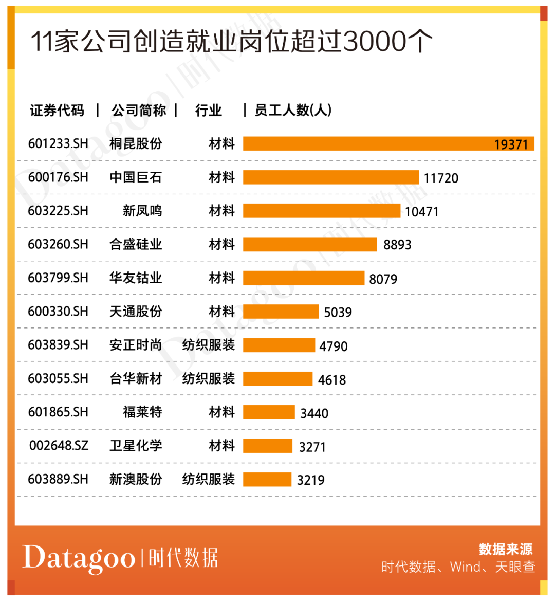 其中,國內滌綸長絲製造行業龍頭企業桐昆股份(601233)創造的就業崗位數最多,員工總數約為1.94萬人。其後,全球領先的玻璃纖維企業中國巨石(600176)擁有員工約1.17萬人,排在第二。此外,國內領先的滌綸長絲製造商新鳳鳴(603225)擁有員工約1.05萬人,排在第三。