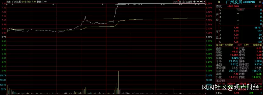 受此消息影響,11月24日,廣州發展股價高開震盪上行,下午開盤後迅速拉昇漲停,截止收盤,股價報收於7.4元,公司總市值為201.74億元。