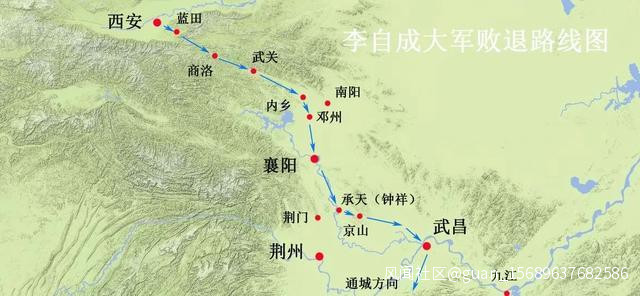 李自成撤出西安後,經藍田入商洛,然後由武關進河南,之後轉移到了根據地襄陽,計劃水陸並進奪取南京。阿濟格大軍一路狂追,李自成又放棄襄陽沿漢水而下,逼走左良玉,佔領了武昌。
