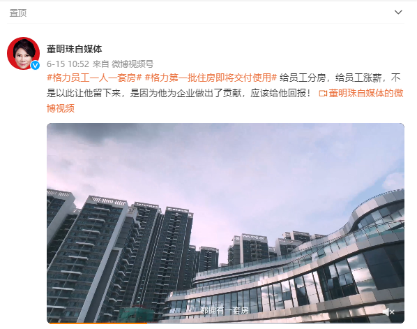 董明珠自媒體微博置頂着格力員工宿舍視頻