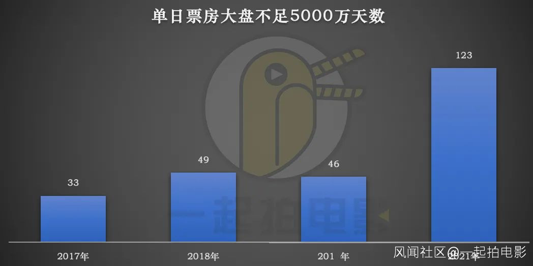一個健康發展的電影市場,不應該有一天是浪費的。2017年的時候,每天日票房產出不足5000萬的只有33天,2018年全年票房突破600億,但單日不足5000萬的天數卻達到了49天。雖然2019年這一數值略微下跌到了46天,但是考慮到全年643億票房,單日應該平均1.76億票房,每一年有着46天低於30%平均值票房。但是這三年對比今年來説,都可以説是太健康了。如果説2018-2019年,單日大盤不到5000萬的天數,基本還在50天左右,今年則突發增長到了123天。而今年還有30多天才結束,預測還會有10個左右5000萬單日票房以下的天數。