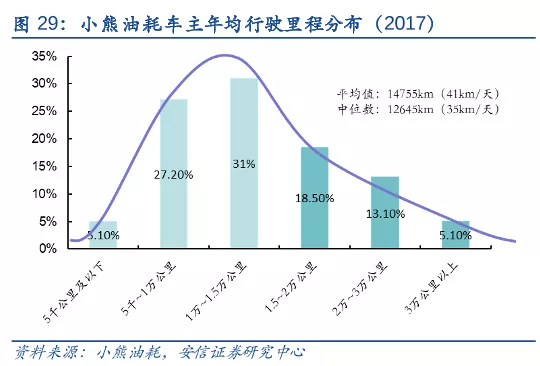 拆解數據,無非是汽車規模和單車行駛里程。單車行駛里程一般在一定範圍內波動,據小熊油耗(用户主要為私家車車主)數據測算,中國家庭用車行駛里程分佈呈正偏態(中位數、眾數小於平均數), 58.2%分佈於年均0.5~1.5萬km(對應15~40km/天)區間,右側長尾人羣即1.5萬km(對應40km以上/天)佔36.7%。