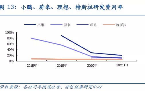 同樣地,P5相關研發費用也依舊低於銷售及一般行政費用,21Q1小鵬研發開支為5.351億元,銷售、一般行政費用為7.208億元,兩者費用率分別為26.9%和36.2%,都高過同行蔚來和理想。