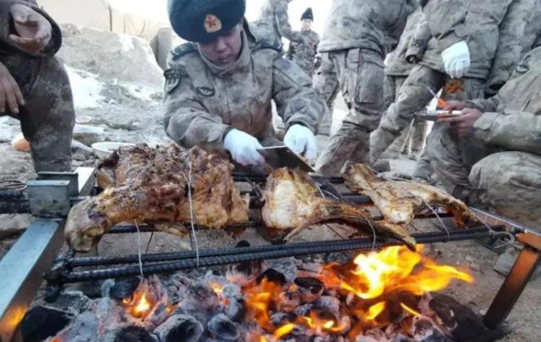 這是海拔5200米陣地上的烤全羊,小夥子們的伙食太棒了。隔壁的印軍估計都要饞哭了。