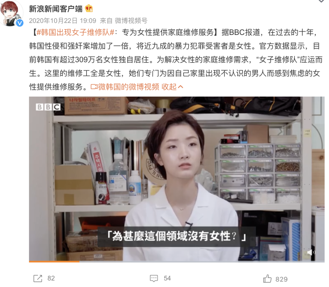 韓國出現了專門為女性提供家庭維修服務的女子維修隊。