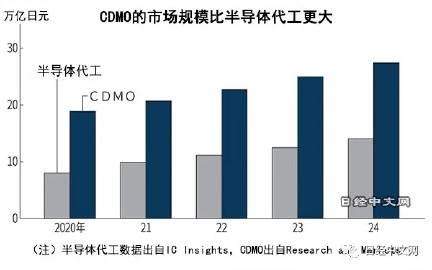 醫藥行業的CDMO相當於電子行業的EMC,可以覆蓋將藥廠的複雜製造,以及後續繁雜的臨牀試驗。合同研製這個市場去年是1600億美元,比半導體代工不到700多億美元的市場,要大一倍以上,而且在繼續膨脹。