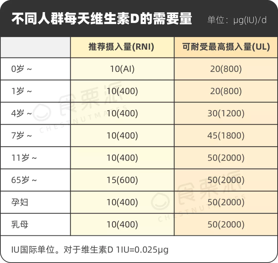 根據中國居民膳食營養素參考攝入量量表,大多數的孩子和成年人每天需要400IU的維生素D,超過65歲每天需要600IU的維生素D。