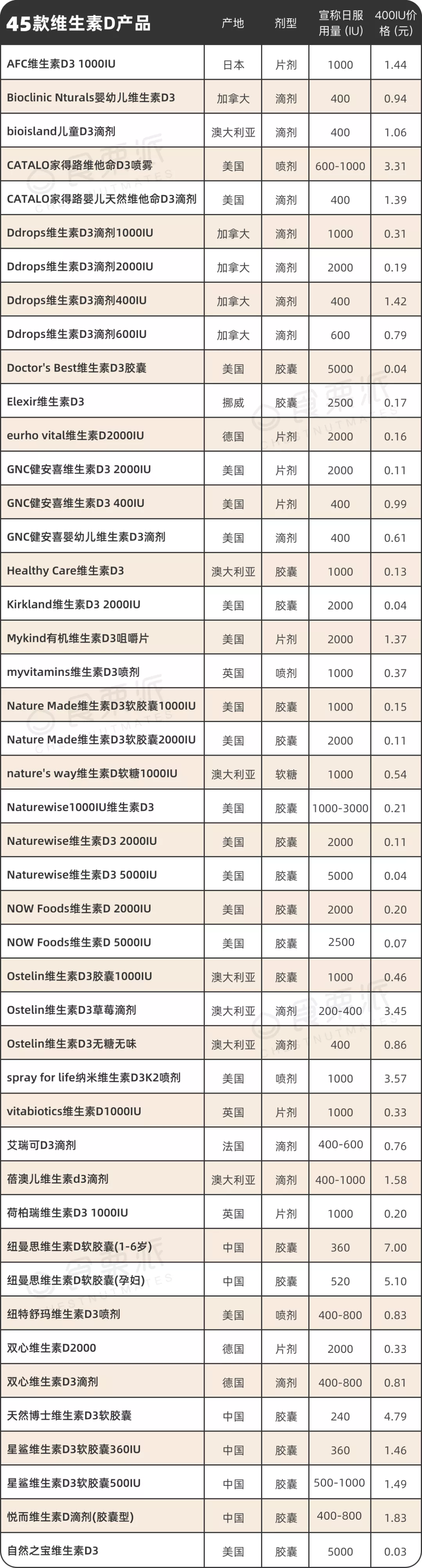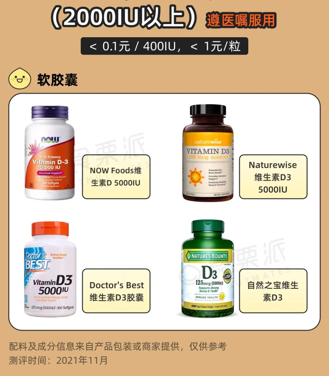 高於2000IU的產品雖然便宜,但並不適合一般人羣服用。這樣看來,一般人選擇600IU~2000IU的產品,性價比最高。