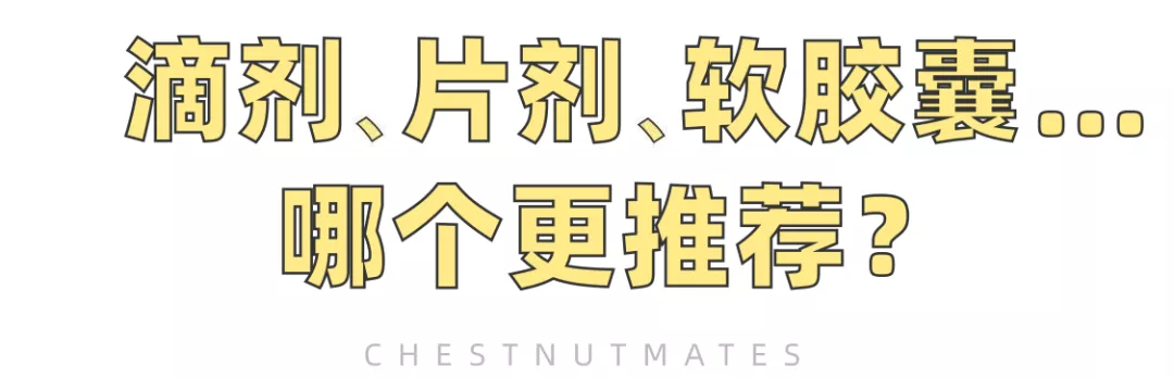 **1.看劑型:**根據需求選擇。滴劑和噴劑比較適合幼兒、老人和有吞嚥困難的人;其他人可以選擇片劑和膠囊,性價比高。