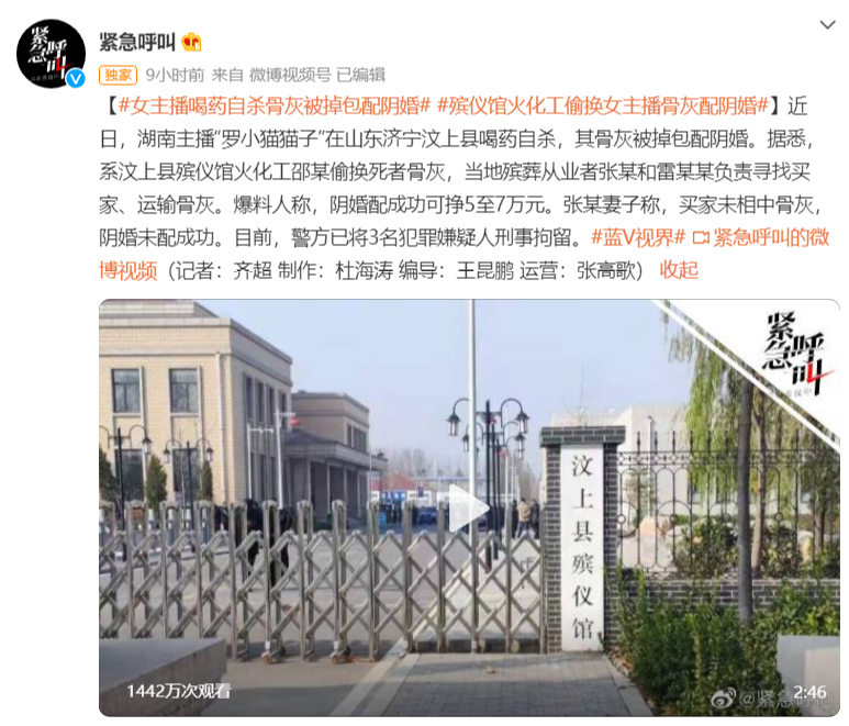 據媒體報道,羅某自殺後,其骨灰被殯儀館員工暗中偷換,其他兩名同夥尋找買家、運輸骨灰,用作配陰婚獲利。