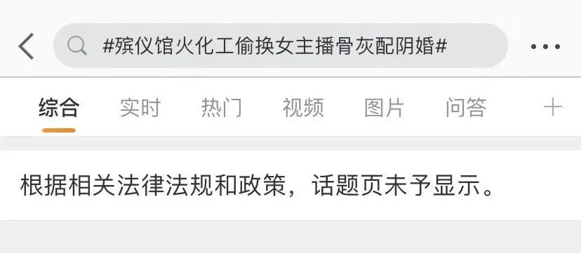 就在剛剛,明明熱度很高的#殯儀館火化工偷換女主播骨灰配陰婚#等相關詞條,已經在渣浪很難搜到了。