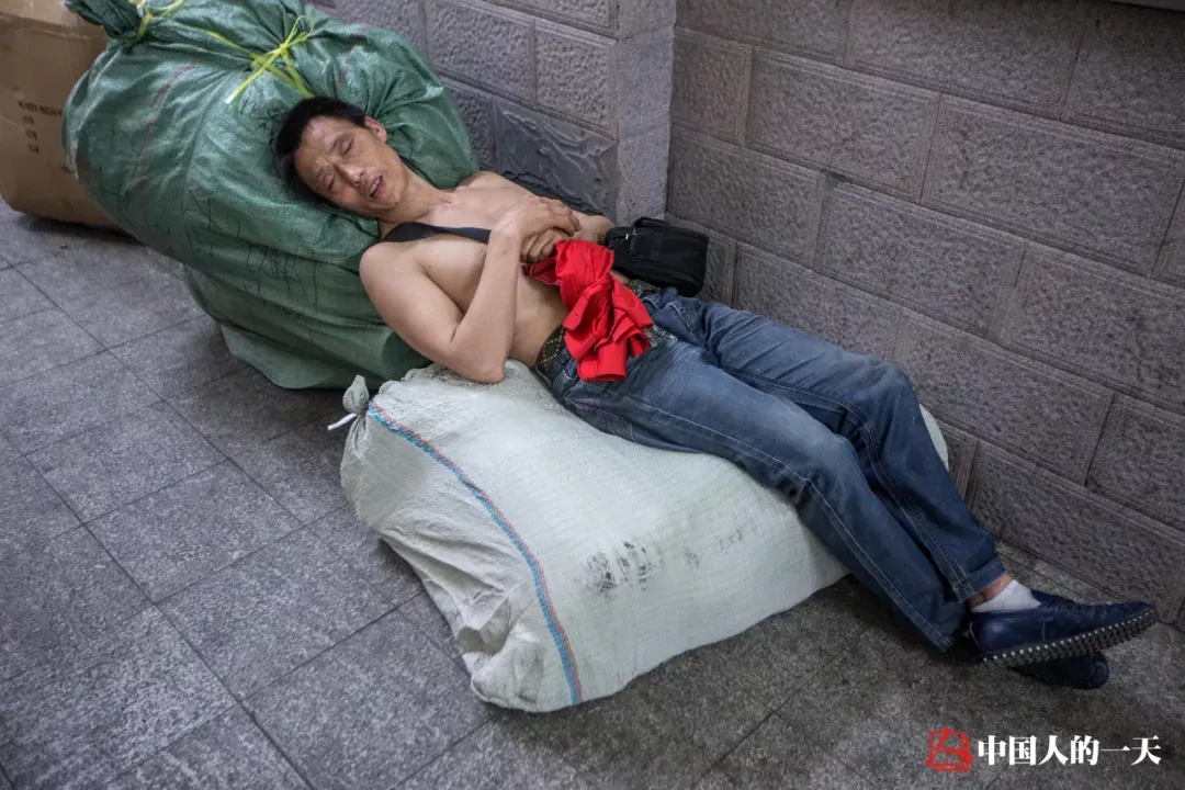 2015年,累極了的他在運貨途中,癱倒在貨物上短暫休息。