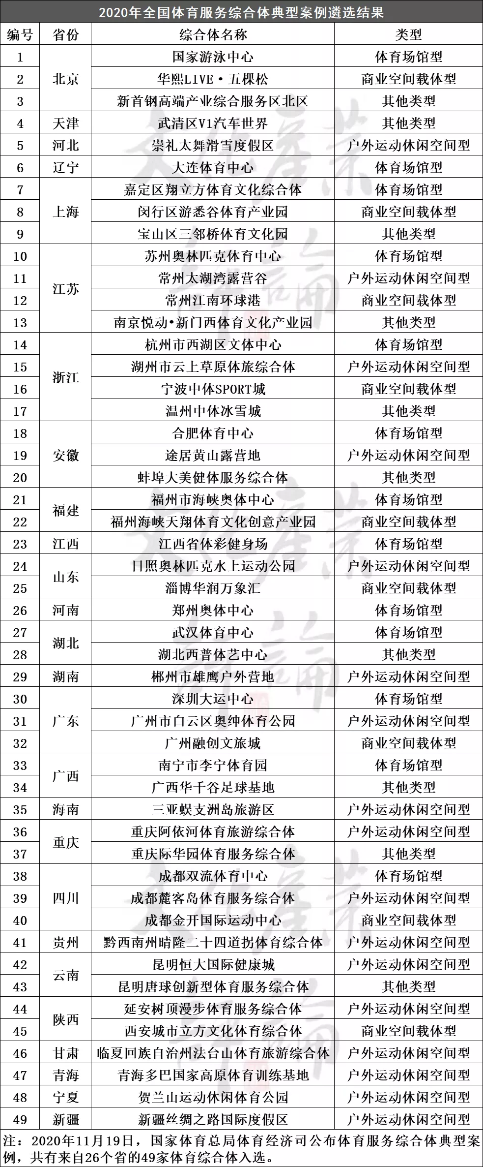 2020年7月,國家體育總局辦公廳印發了《關於報送體育服務綜合體典型案例的通知》,在全國範圍內徵集了一批體育服務綜合體典型案例。同年11月,體育總局體育經濟司公佈典型案例遴選結果,共有來自26個省的49家體育綜合體入選,對促進體育旅遊消費回補起到引導作用。