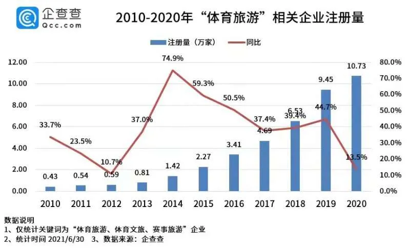 目前,全球體育旅遊產業年均增速在15%左右,而我國體育旅遊市場份額不足5%,潛在市場規模達5萬億。企查查數據顯示,2019年與2020年體育旅遊相關企業分別新增9.45萬家和10.73萬家,2021年上半年新增7.47萬****家,同比增長174.4%。