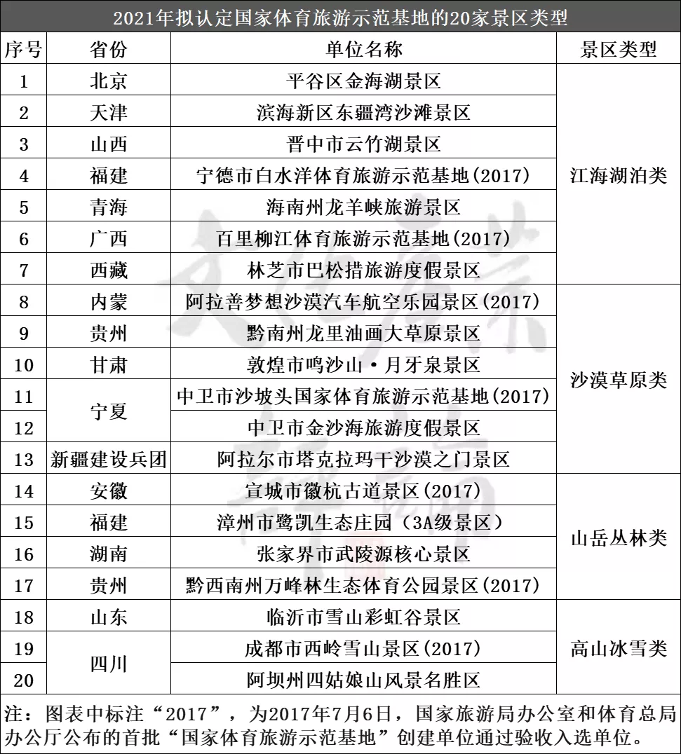 此次入選示範基地的景區高達20家,佔總數的42.6%,主要包括北京平谷區金海湖景區、天津濱海新區東疆灣沙灘景區等江海湖泊類景區7家,內蒙越野e族阿拉善夢想沙漠汽車航空樂園景區、黔南州龍里油畫大草原景區等6家,張家界市武陵源核心景區、宣城市徽杭古道景區等山嶽叢林類景區4家,成都市西嶺雪山景區等高山冰雪類景區3家。