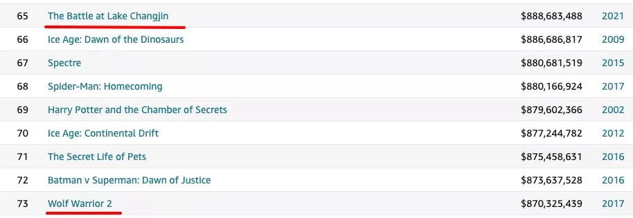 根據IMDB數據顯示,《長津湖》全球票房已超過8.8億美元,超越《戰狼2》成為全球票房最高的中國影片。同時,也輕鬆PK掉一眾好萊塢大片,拿下2021年全球票房冠軍。