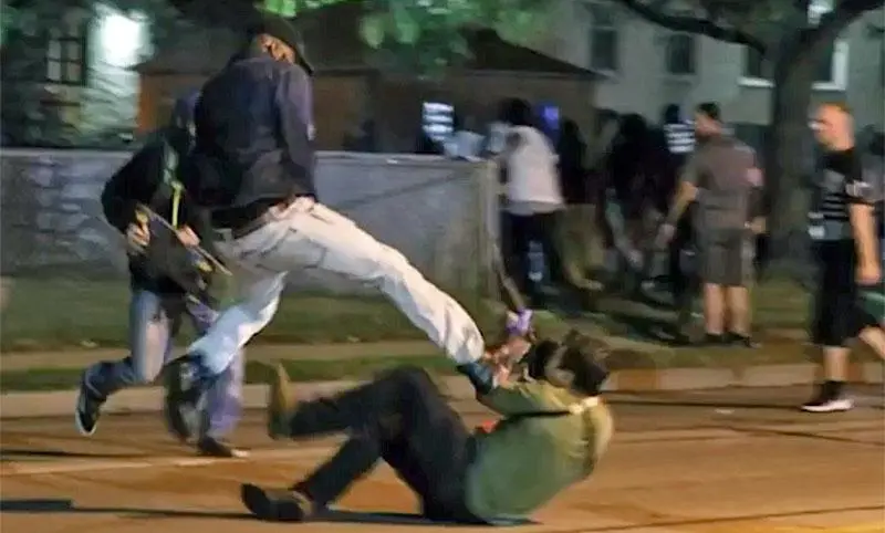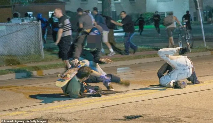 在向着封鎖線移動的過程中,附近聽到槍聲的抗議者們追了上來,試圖抓住裏滕豪斯,追逐過程中Kyle摔倒,數名抗議者接近並開始攻擊他。