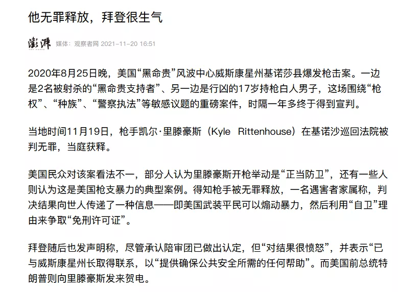 2021年11月19日,在美國媒體上熱炒了將近一年的基諾沙槍擊案終於塵埃落定,陪審團裁定所有罪名皆不成立,當事人裏滕豪斯(KyleRittenhouse)案當庭獲釋。