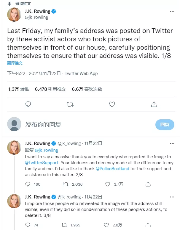 2021年11月22日,羅琳一口氣發了八條推特並置頂,質疑一些支持跨性別運動的活動人士站在自家門口拍攝照片,背景中可以看到她傢俱體地址。隨後這張照片被髮布在推特上,以抗議羅琳針對跨性別羣體發表的爭議性觀點。