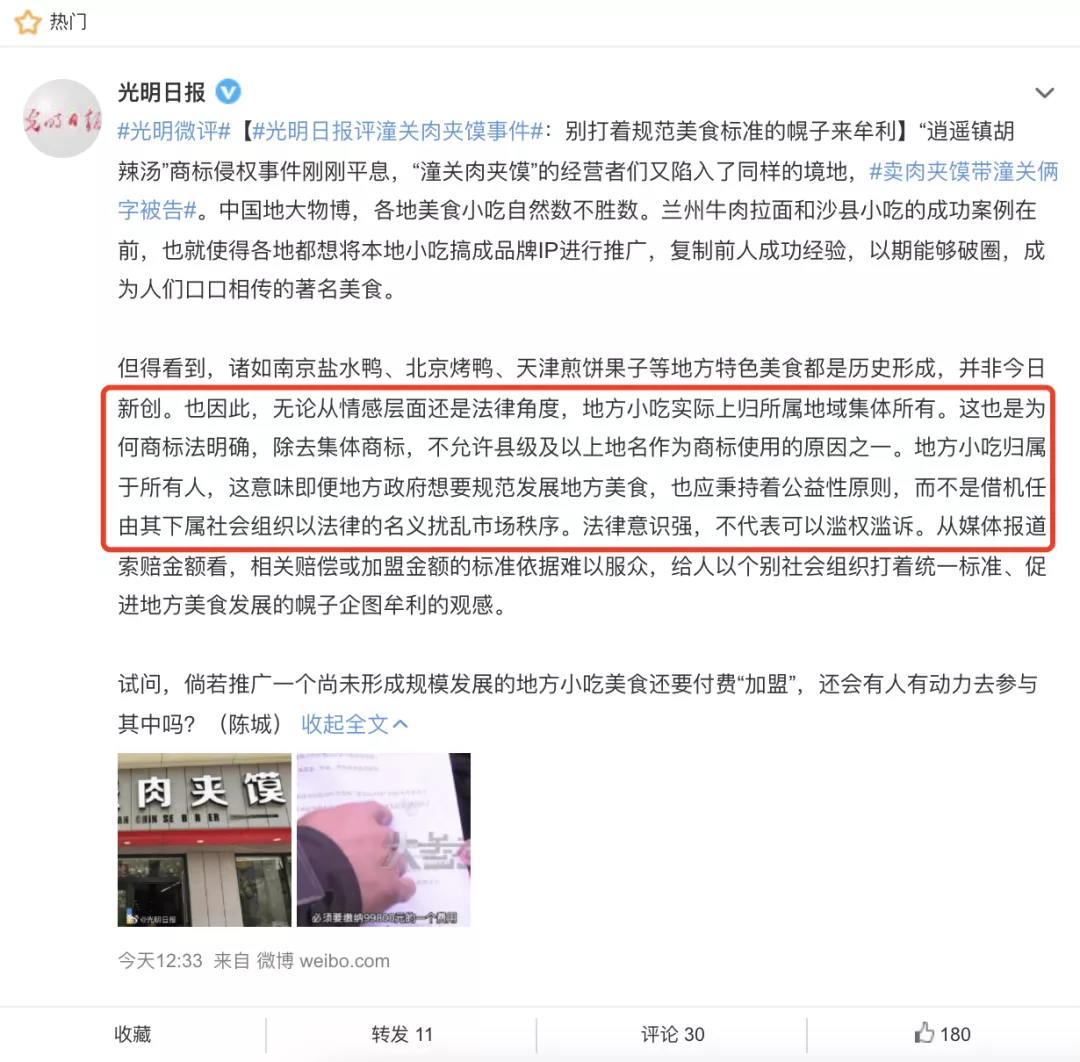 別人用了幾十年的招牌,本身就是“地名+小吃名”的簡單組合,突然就有人站出來説你這店名侵權,你得加錢。