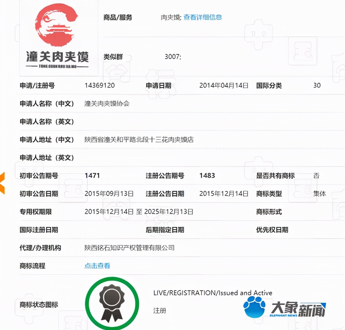 潼關肉夾饃協會持有方便食品類“潼關肉夾饃”商標,該商標於2014年4月申請,並於2015年12月完成註冊。