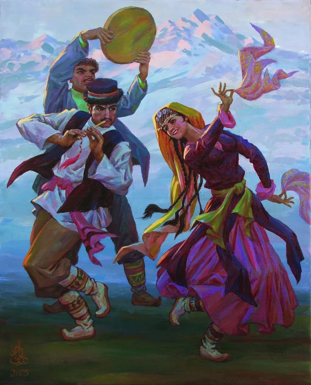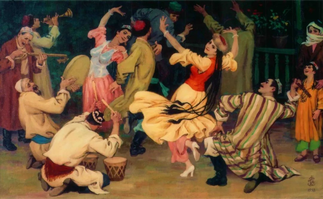 他創作這幅畫最強大和最持久的動力是自己從小到大的生活裏對木卡姆藝術的接觸,從而引發他對本民族音樂和民俗源源不斷的熱愛。