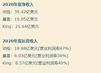 可問題在於,暴雪的盈利和增長始終是不如動視的。所以在合併後,暴雪是一直處於弱勢一方,這一點從它們的財報中就能看得出來。整個 2020 年動視暴雪淨收入 80.9 億美元,其中動視 39.42 億美元,盈業利潤率 47 %,暴雪 19.05 億美元,盈業利潤率 36 %