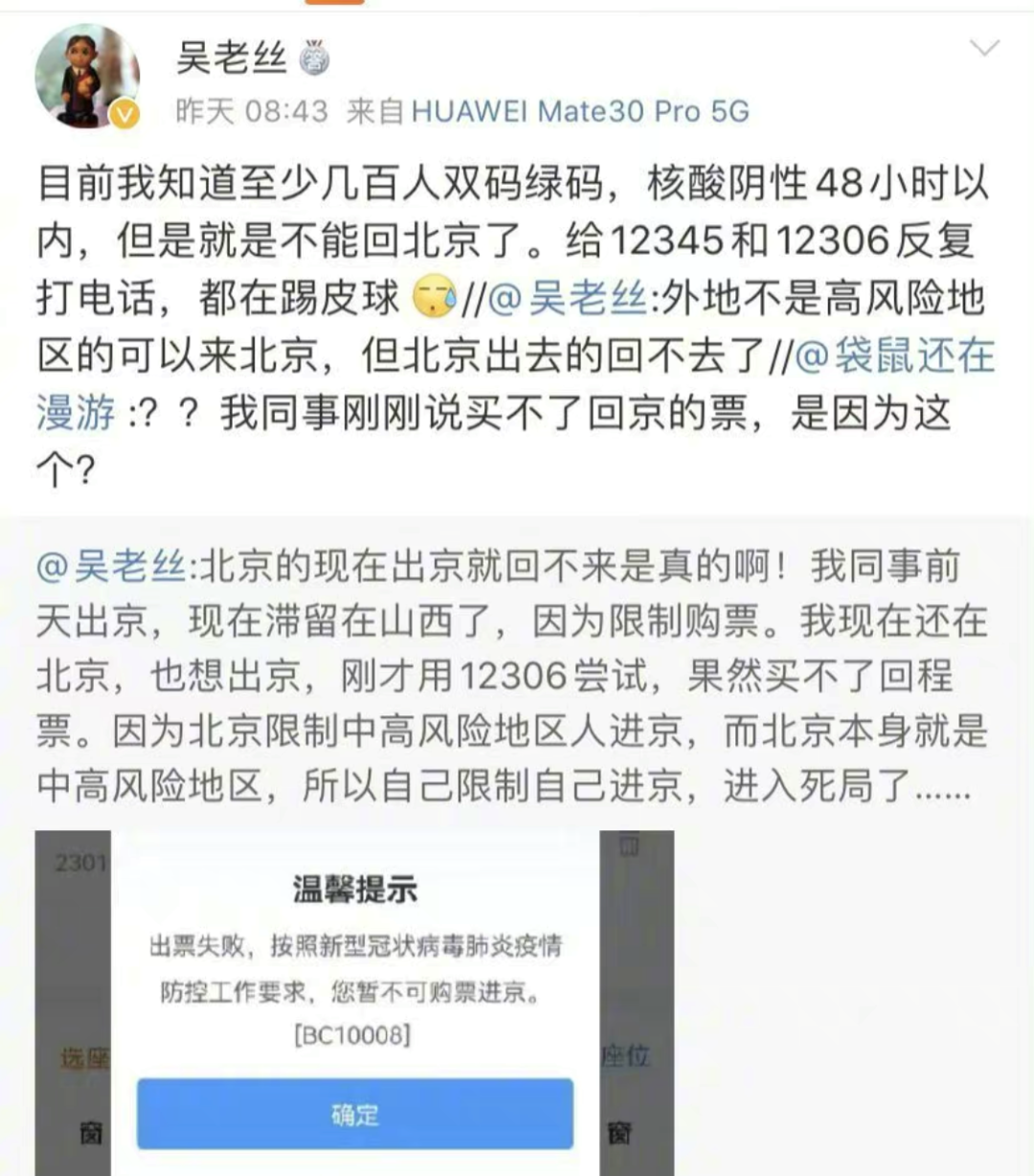 除了出不了京,還有網友在出北京後,即便持有雙綠碼和48小時核酸陰性證明,仍無法購買高鐵返程票回京。