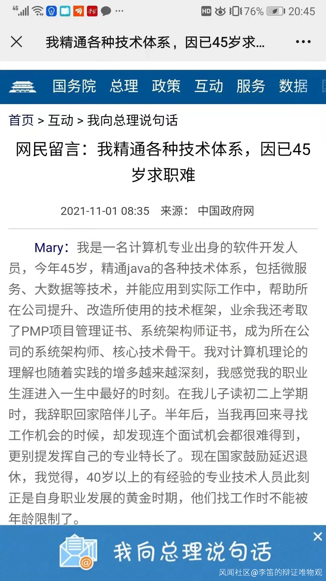 Mary:《網民留言:我精通各種技術體系,因已45歲求職難》,中國政府網,2021年11月1日