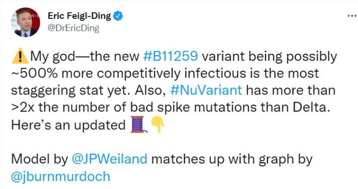 新毒株跟Delta沒有中和抗體交叉免疫力,可能是新“血清分型”。3.流行病學專家Eric Feigl-Ding博士説該變種傳播力比Delta高了500%