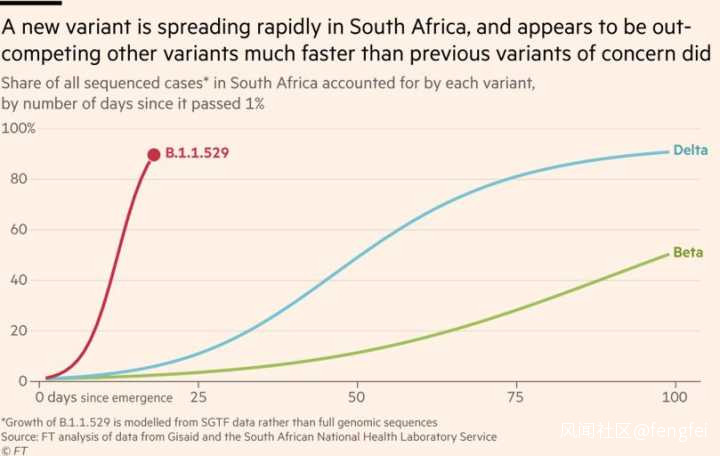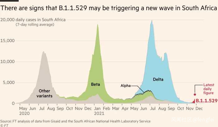 灰色為原始毒株、綠色為beta,灰色是alpha,紅色為delta,黃色為C.1.2,藍色為新出的B.1.1.529B.1.1.529在南非增長迅猛,已經引發新一輪波峯。[[1]](https://hk.outputnews.com/2021/fengwen/news_2021_11_27_1323213)