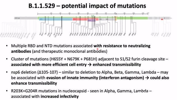 毒株存在多個 RBD 和 NTD 突變,影響中和抗體(和治療性單克隆抗體)的有效性靠近 S1/S2 弗林蛋白酶切割位點的突變簇 (H655Y+N679K+P681H),更有效的進入細胞,更強的傳播能力。nsp6 刪除 (A105-107)-類似於 Alpha、Beta、Gamma、Lambda的突變,可能與逃避先天免疫有關(干擾素拮抗)→ 也可以增強傳染性。核衣殼中的 R203K+G204R 突變 - 見於 Alpha、Gamma、Lambda-與傳染性增加有關。2.從B.1.1.529的表現看,突破免疫應該可以確認了