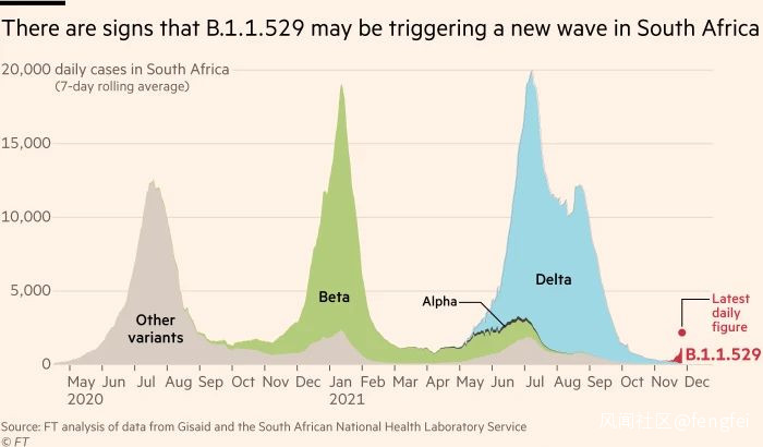 灰色為原始毒株、綠色為beta,灰色是alpha,紅色為delta,黃色為C.1.2,藍色為新出的B.1.1.529B.1.1.529在南非增長迅猛,已經引發新一輪波峯。[[1]](https://hk.outputnews.com/2021/fengwen/news_2021_11_27_1323213)