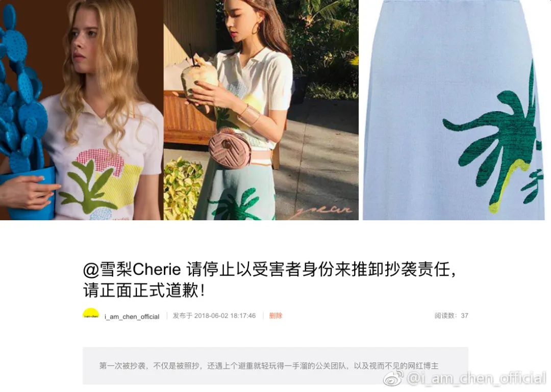 同年6月,雪梨家的服裝也被曝抄襲原創品牌i-am-chen,設計師在公眾號、微博等多渠道發文要求雪梨公開道歉。雖然雪梨對涉嫌抄襲的商品做了下架處理,但雪梨從始至終都未公開道歉。