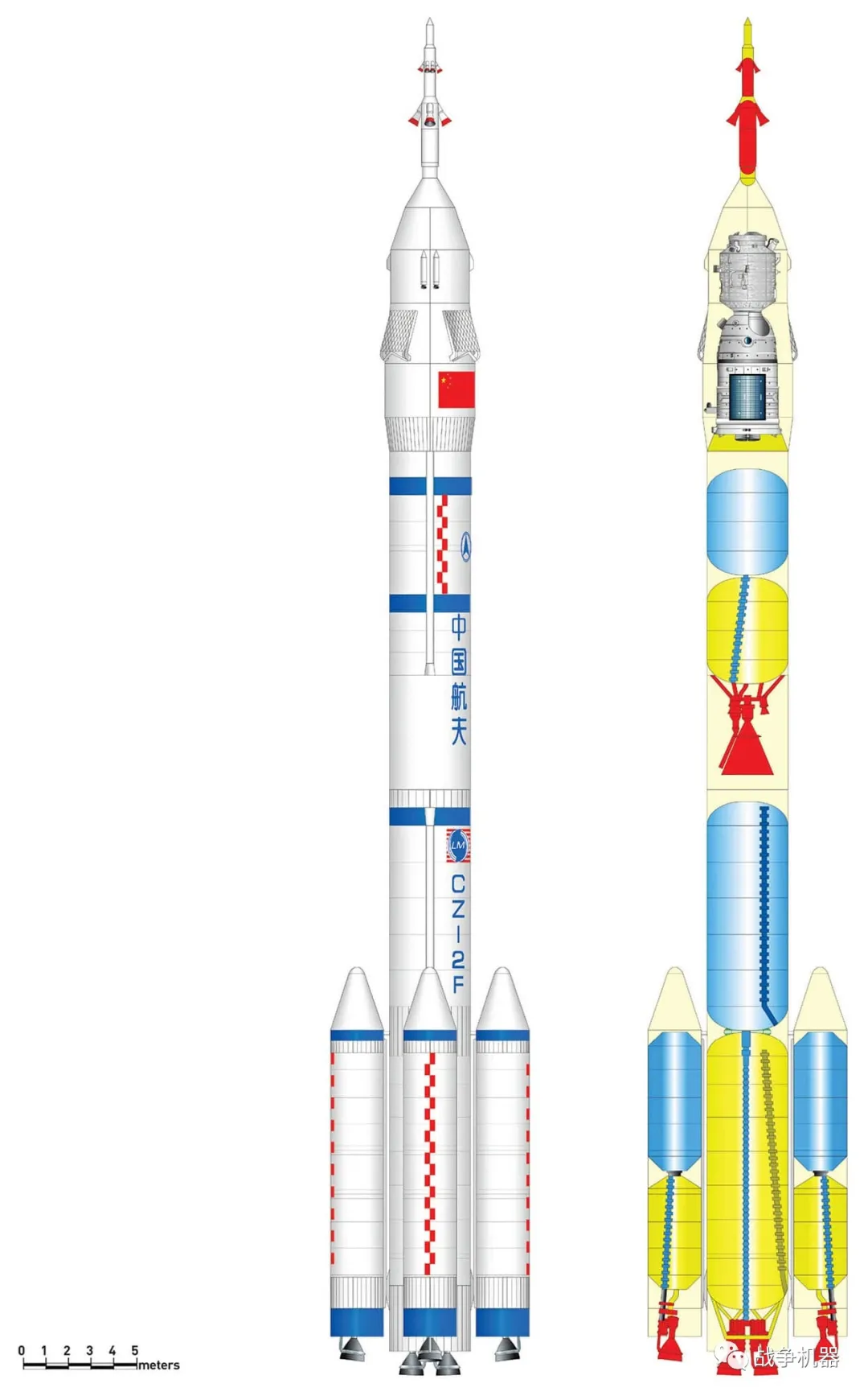 與此同時,錢學森和他的副手們把目光投向了一個更高的目標。在20世紀70年代,他們開始在中國DF-5洲際彈道導彈的基礎上開發一種更強大的火箭,即長征二號。該系列開始於温和的長征-2A,一個幾乎32米長的兩級火箭,升空重量為172,365公斤。到20世紀90年代,更強大的長征-2F出現在中國主要火箭製造商--中國運載火箭技術研究院(CALT)的繪圖桌上。它是-2A旁邊的一個巨人,高度為62米,直徑為3.35米,質量為464000公斤。它包括一個由4台YF-20B發動機驅動的第一級,一個由1台YF-24B發動機驅動的第二級,以及4台YF-20B捆綁式助推器。